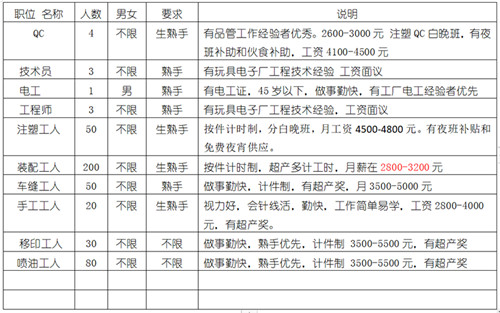 永州星月投资科技有限公司成立于2014年7月,属港资企业,主要生产儿童玩具,大部份产品出口欧美国家,工厂位于蓝山县科技路政府标准厂房区(东方大道政务中心隔壁),占地面积40000平方米,现有员工近800人,因生产需要招聘技术管理人员、普工一批,设有注塑、裁床、装配、车缝、手工车间,工艺车间,车间宽敞明亮,环境优美,通风条件好,