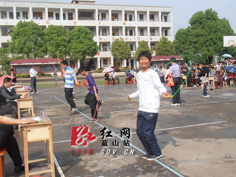 红网蓝山站4月14日讯(通讯员 王练军) 4月12日下午蓝山三中举行了跳绳比赛。比赛时操场上一片欢腾的景象,只见一根根彩绳飞舞,一个个选手龙腾虎跃,这次跳绳比赛凝聚了老师们、同学们的热情。这次跳绳比赛丰富了同学们课余生活,增进同学之间的默契和团结合作的能力,让同学们深刻体会到集体荣誉,更让同学们在运动中体会到了快乐。