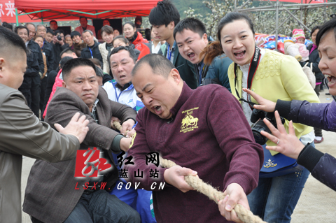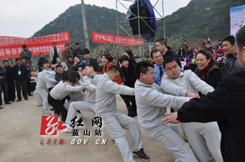红网蓝山站3月22日讯(记者 黄俊北 何明贵) 3月22日上午,2014湘江源生态文化旅游节暨第三届梨花节美丽乡村拔河比赛在大洞梨园举行,来自全县各行各业的20支代表队参加比赛。县委常委、宣传部长刘素萍,副县长赵七秀等领导出席活动现场。