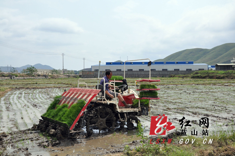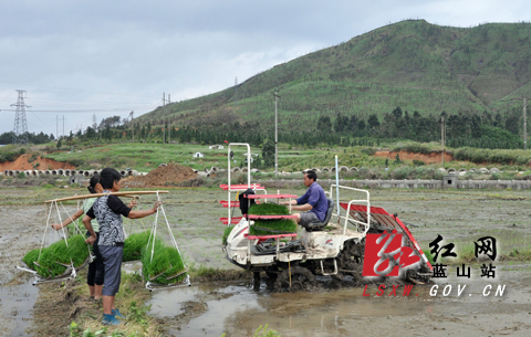 红网蓝山站4月17日讯(通讯员 杨雄春) 今年,蓝山县农业部门在春耕生产中普及机械插秧,平均一台插秧机一天可插田15亩,大大提升了农业耕种效率。图为蓝山同心水稻种植专业合作社的种田大户在播插早稻秧苗。