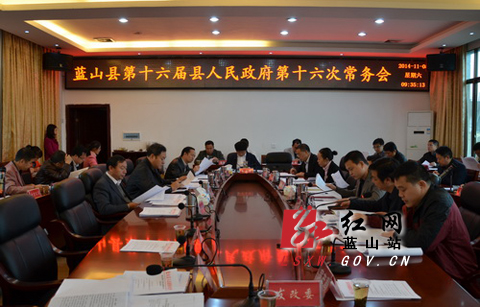 会议听取并讨论了《关于县政府序列议事机构清理情况汇报》、《关于公务员王莉同志辞职的报告》、《关于安全生产工作情况汇报》、《关于全县发证矿山地质环境治理备用金收存和管理情况汇报》、《关于“十三五”规划编制情况汇报》、《关于清理违法违规建房应缴税费和政府性基金的工作方案》、《关于管道燃气特许经营项目情况汇报》等,原则上同意了《关于加强安全生产监管能力建设的实施意见(草案)》、《蓝山县第二次全国地名普查实施方案(送审稿)》、《蓝山县城市生活无着的流浪乞讨人员救助管理办法(送审稿)》、《关于清理违法违规建房应缴税费和政府性基金的工作方案(征求意见稿)》、《蓝山县农村宅基地管理办法(讨论稿)》和《蓝山县管道燃气特许经营项目实施方案(征求意见稿)》。