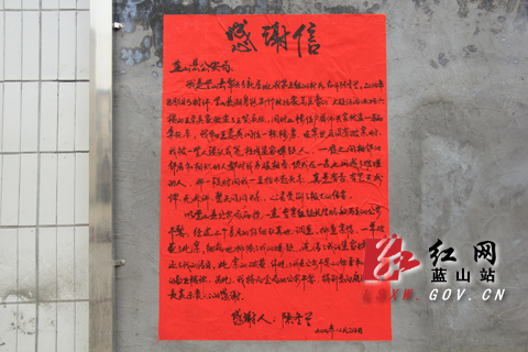 红网蓝山站12月26日讯(通讯员 彭文杰) 没有大张旗鼓的赠锦感谢仪式,也没有充溢讴歌赞美之词,12月24日下午,一封用红纸书写的感谢信被默默贴在了蓝山县公安局宣传公告栏的墙上,家住荆竹林场附近的陈冬兰用贴感谢信的方式,表达自己对蓝山公安民警的深深谢意。