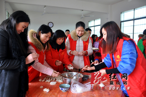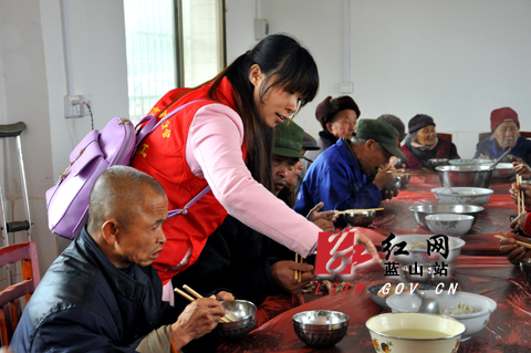 红网蓝山站2月22日讯(通讯员 杨雄春 李果娜) 2月22日元宵节,蓝山县塔峰镇牛承敬老院里传出阵阵欢笑声。原来,蓝山县义工协会的60多名志愿者们冒雨早早来到塔峰镇牛承村敬老院,同这里的30多名孤寡老人共度元宵节。打扫房间、免费体检、表演节目、包饺子、煮汤圆……蓝山义工协会的志愿者们分头行动,忙得不亦乐乎,老人们心里暖洋洋的,脸上笑开了花。89岁的陈春芹老人站在一旁乐呵呵地说:“有这么多好人来看我们,今天好高兴!”