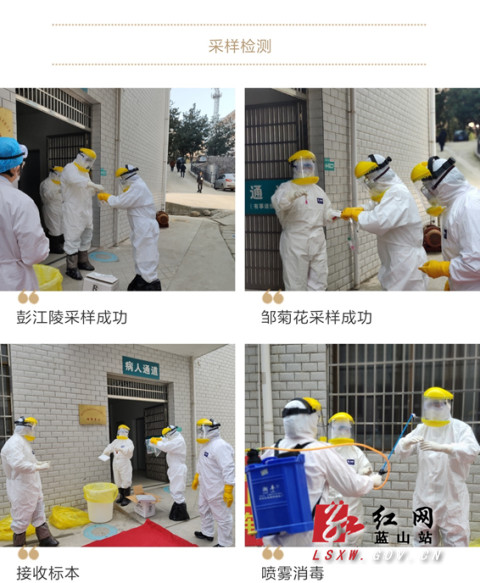 为不遗漏一人,坚决守好疫情防控,确保疫情不输入,守护好蓝山人民群众生命健康和生命安全,国家卫健委要求定点医疗机构对新发现的疑似病例及时进行采样检测。疑似病例采样是一项危险的工作,操作采样的医务人员很有可能被病毒感染。这次与彭江陵一同采样的邹菊花是一名内科主治医师,面对疫情她没有退缩,是第一位主动到感染科上班的女医生。参加过采样的感染科李胜春主任,到发现疫情后一直坚守岗位,疫情来临使得感染科人手不够,她上完白班还主动上晚班,每天认真对感染科的患者进行诊治,一声声问诊,一遍遍安慰,一句句嘱咐,忙碌的她却感觉不到累,因为责任与担当在支撑着她。张宇医生在感染科工作2年,二胎马上就要出生,他不怕被感染,没有退缩,在感染科管理了一半的留观隔离病人,正月初三女儿出生,他才休假回去陪伴妻女。感染科邓春秀医师是一位还在哺乳期的宝妈,家中宝宝才十个月,她依然每天坚守在科室,并参与疑似病例采样。在危险面前,他们将个人安危置之度外,用职责和奉献构筑起一道道生命的防线。